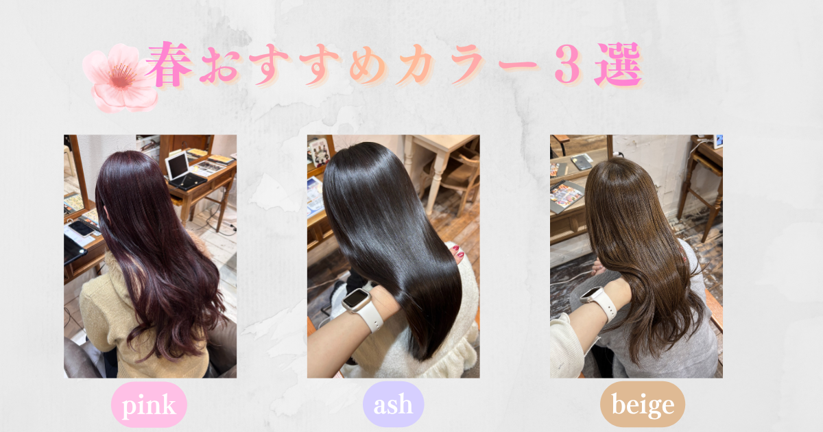 春に人気のおすすめカラーを3つ厳選して紹介🌸✨ピンク・ベージュ・アッシュなど、ブリーチなしでできるカラーをわかりやすく解説!自分に似合う春カラーを見つけたい方におすすめです🎀